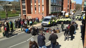 Cordons of police officers were created around the building, particularly at the two entrances. For a period of time, they had also barricaded the two entrances; CCTV and police dog unit patrol were also present. At one point, a helicopter was hovering above ground. I drove onto the campus, which took some time as many roads were blocked, and attempted to park near the building where the occupation was taking place, but was aggressively moved on by the private security guards under the watchful eye of about 5 police officers; the private security have now filmed me a number of times, not just today but also during the Easter weekend whilst delivering food to the students, which was in the end denied most of the time.