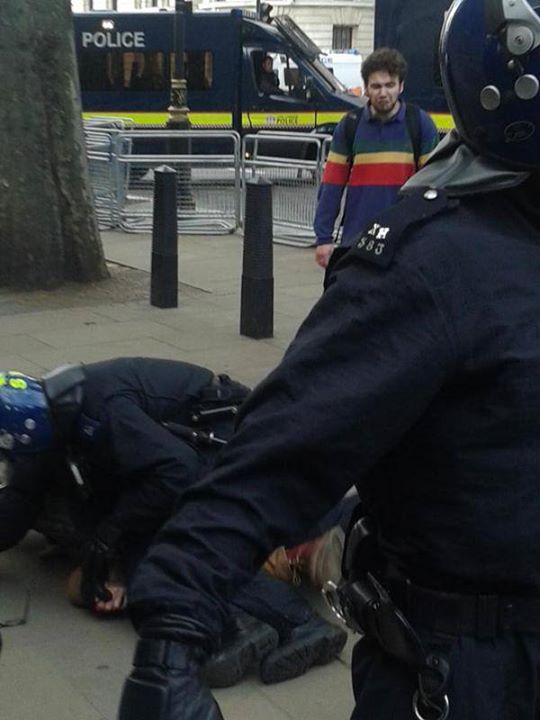 One protester, Imogen Tyreman posted an image on Facebook: “This is from me, something I saw, not as a retaliation to the violence of the person involved; they, like us, were just trying to leave at that time. This is simply one example of many of how the police reacted when we tried to exercise our democratic right and show that we were unhappy with the results of the General Election.”