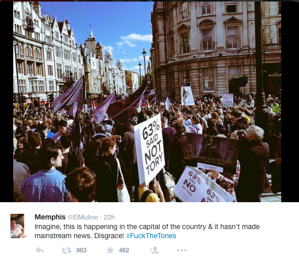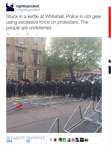 It was also noticeable yesterday how the initial silence from most media outlets was very quickly replaced by over the top reports of “riots”, “vandals” and “mobs” taking over central London once the riot police were deployed.