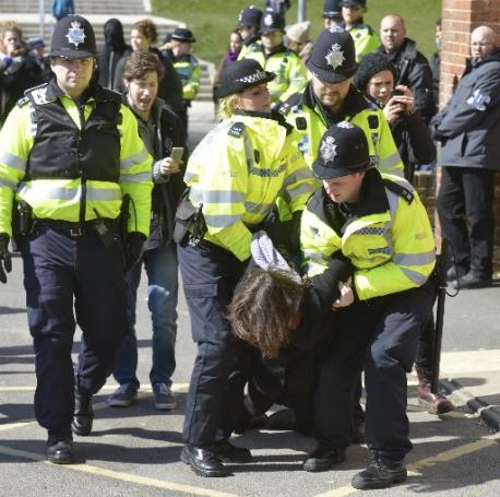 police aggression and brutality were obvious. The student was surrounded by a number of officers so that it was difficult to film. Whilst surrounding her, those around her could see her being kicked and punched by the police. She was then dragged along the pavement; at one point the dragging was severe enough for both of her shoes to come off. One of the four students was arrested for violent disorder, which carries a custodial sentence of up to 5 years and it is the same charge that saw Alfie Meadows and Zak King being dragged through courts for the past two and a half years. Where is justice in all this? Other three charges appear to be for criminal damage. It is not clear at this stage whether these charges related to today only, or last week, too. First information that has come in from the legal observers who were on campus and witnesses, suggests that the charges related to today. The four students were then taken into vans and driven off to one of the Brighton police stations. Now, they face hours and hours of waiting in a police cell and consequently further intimidation.