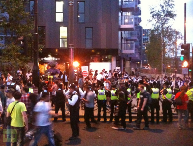Scuffles occurred near the Olympic Stadium on the outskirts of the Olympic Park with participants saying they were being “kettled”. Some witnesses said police violently pushed and punched cyclists aside to get David Beckham through traffic.