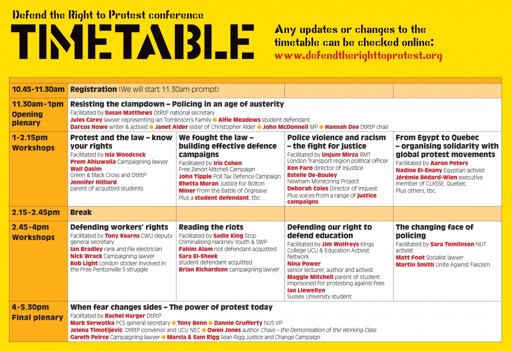 The full timetable for Defend the Right to Protest’s first national conference - Austerity, Injustice & The Power of Protest - has been released.